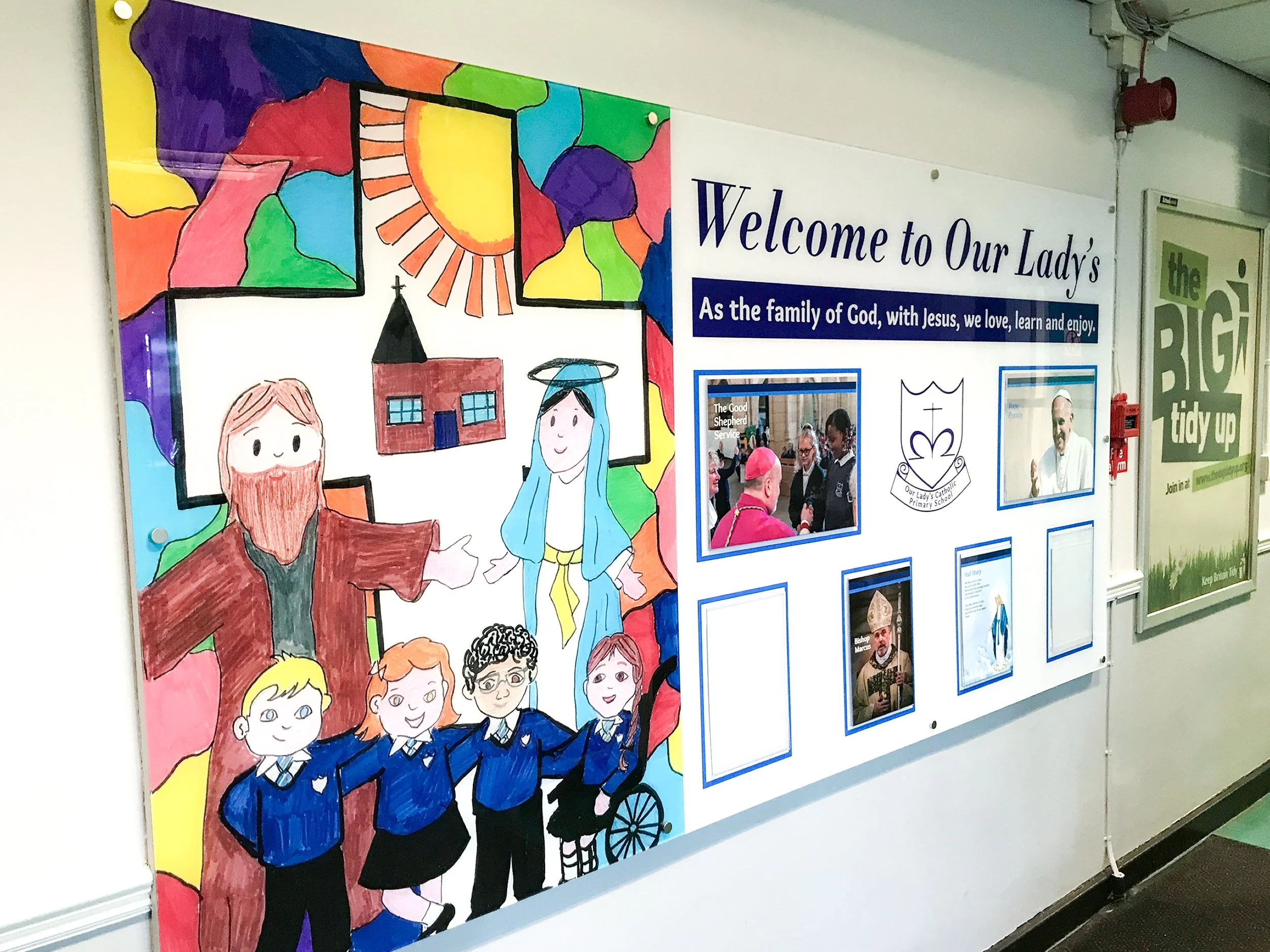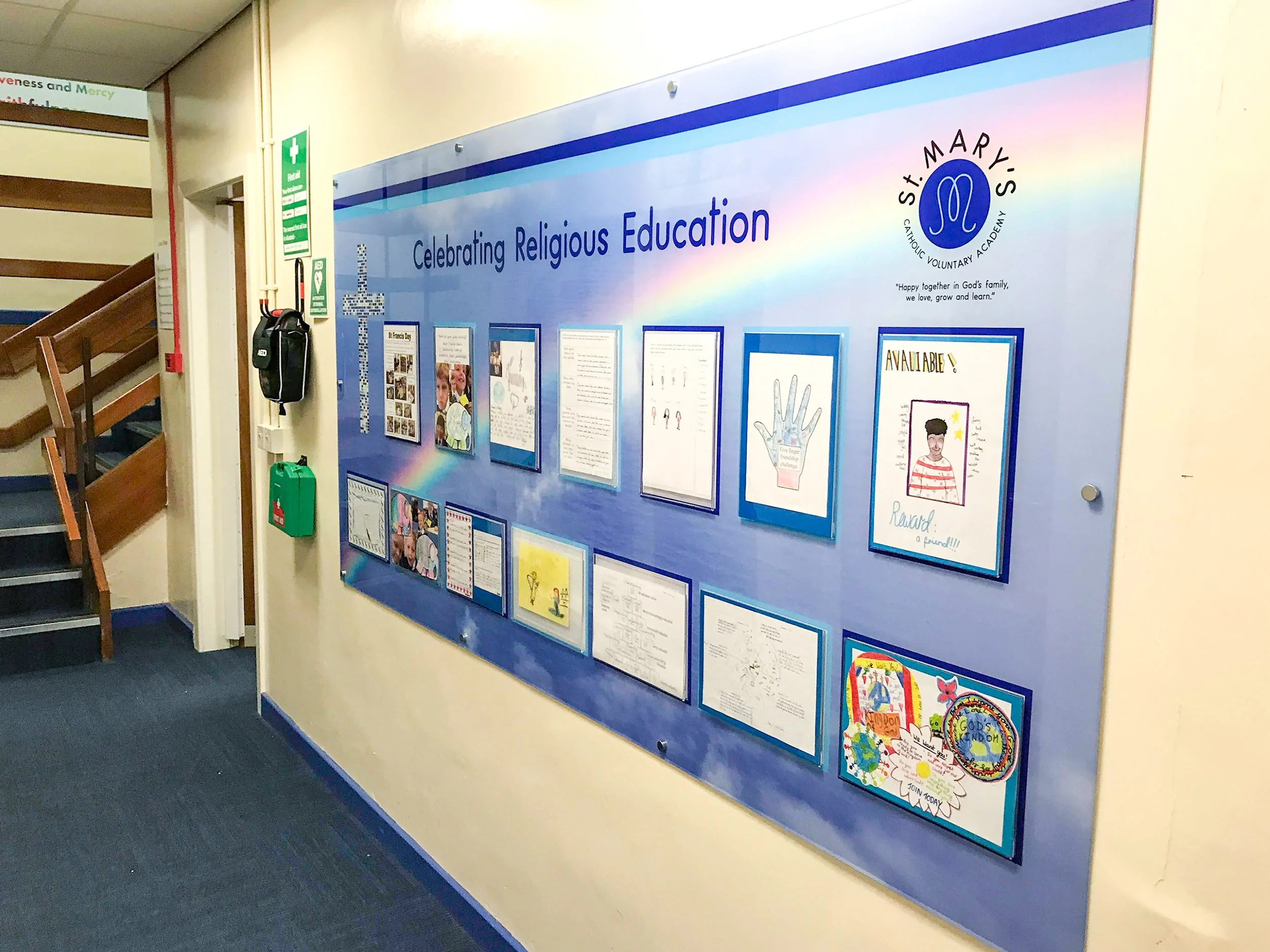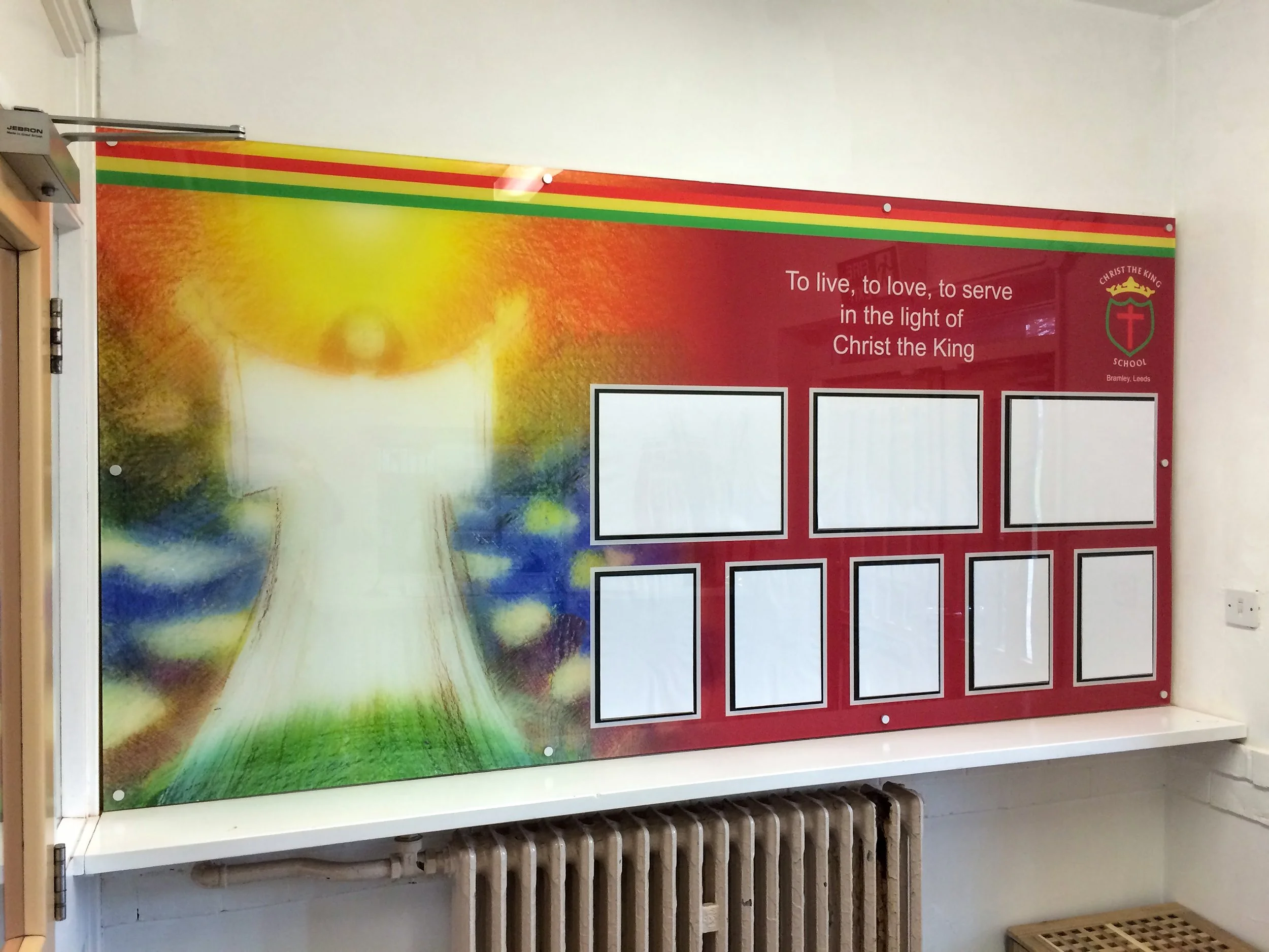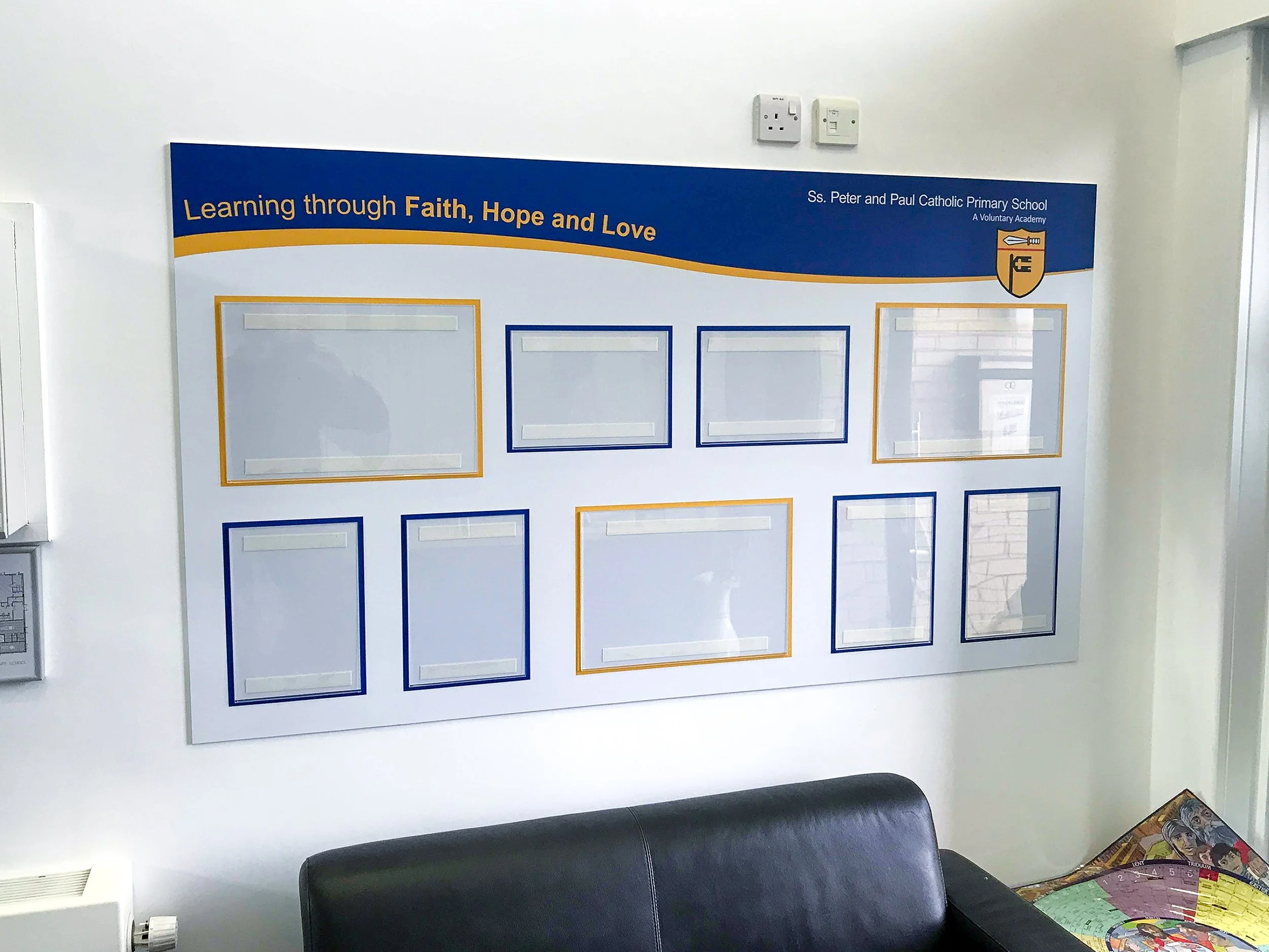 Acrylic panel with acrylic document holders fitted flush to wall with mirror fixings used in school entrance area