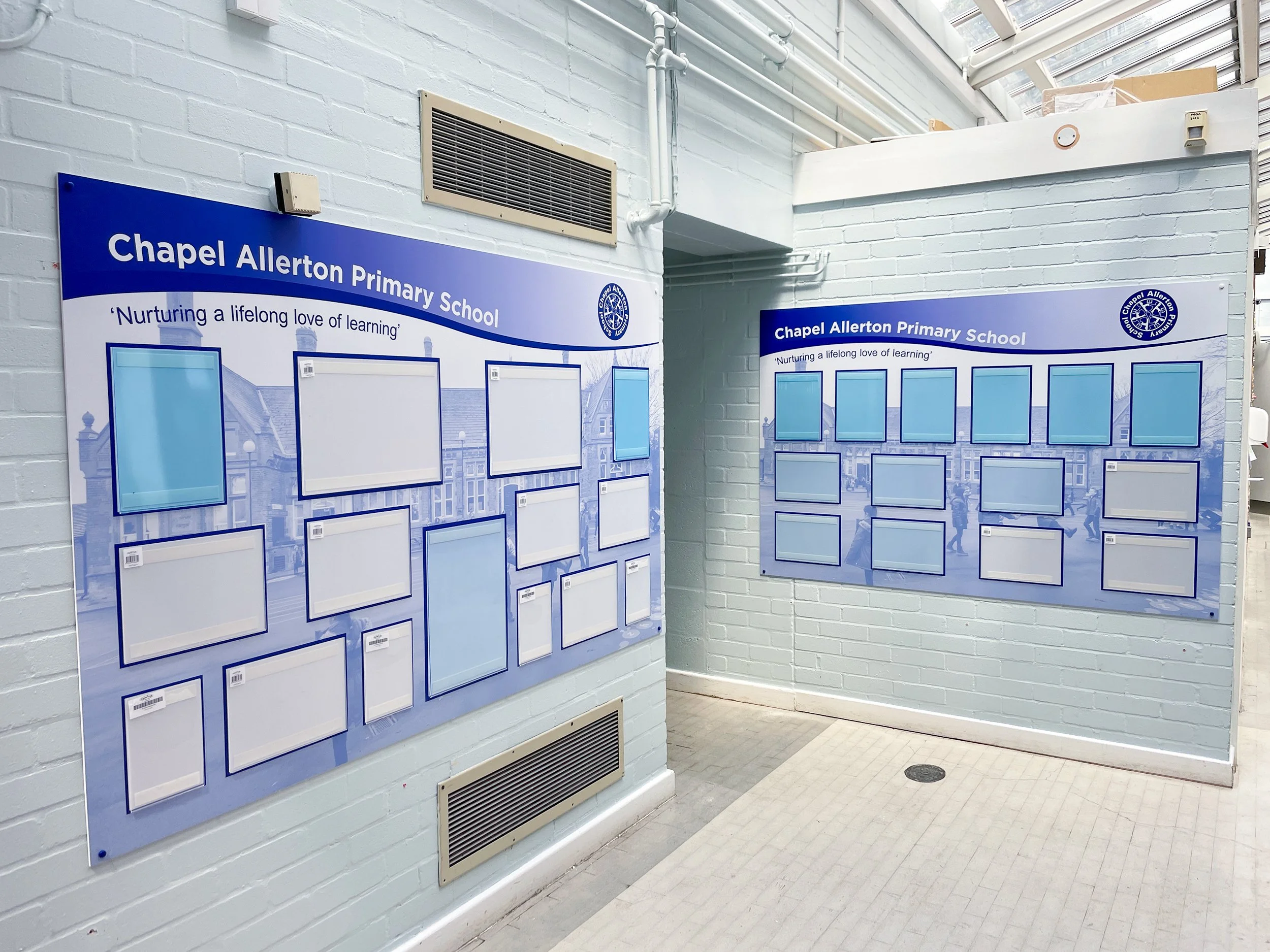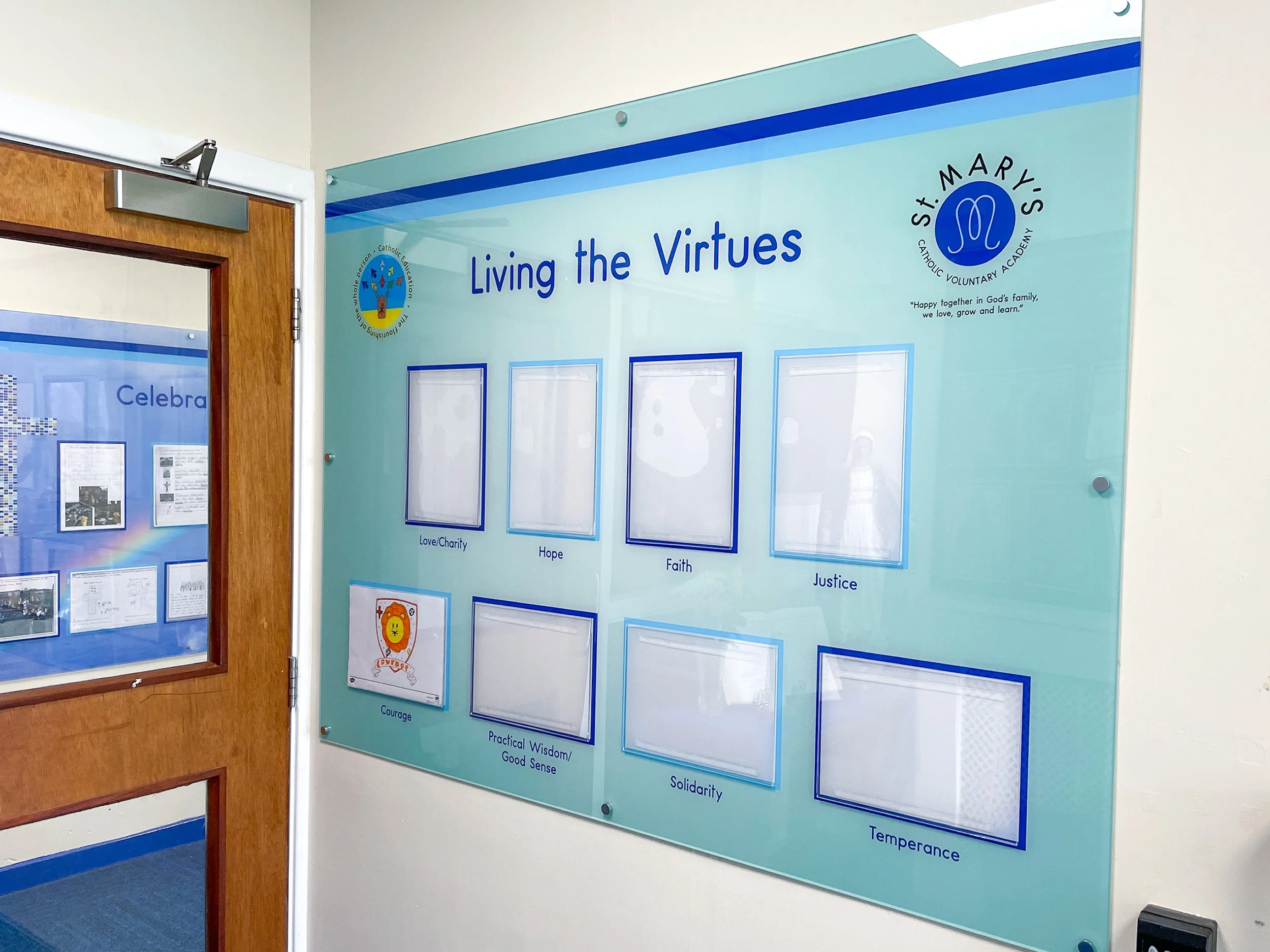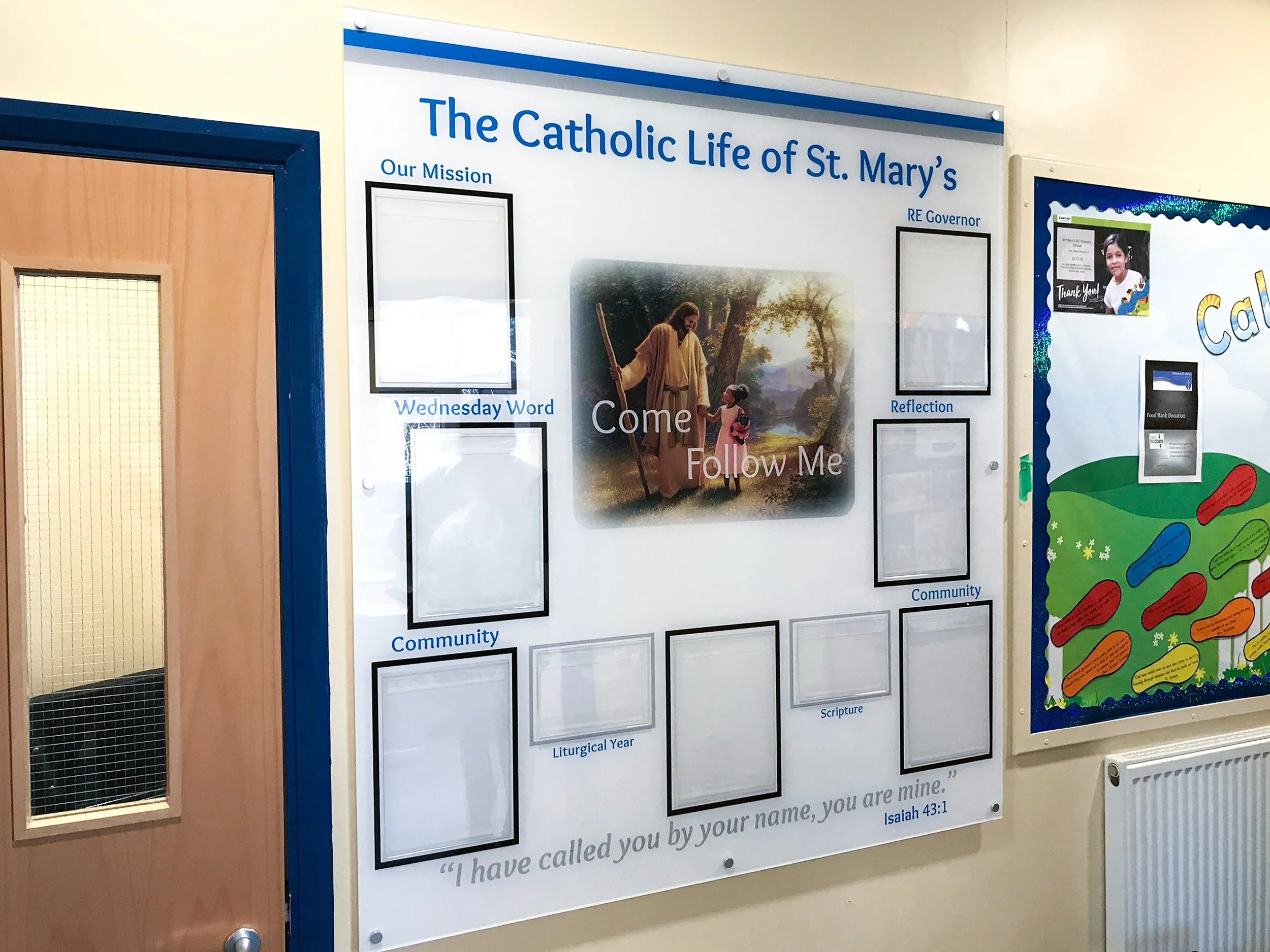 Acrylic panel with acrylic document holders fitted flush to wall with mirror fixings used in school entrance area
