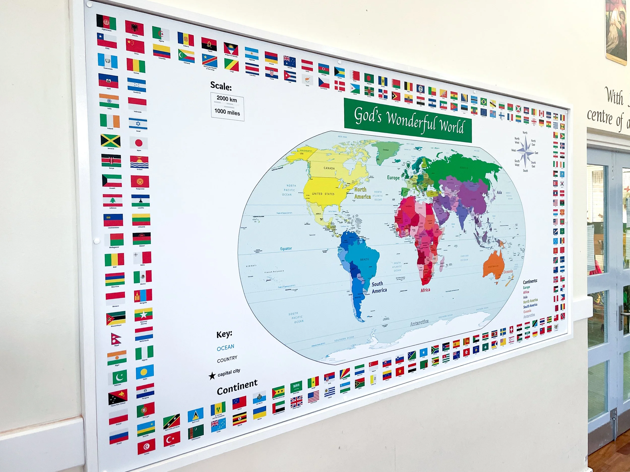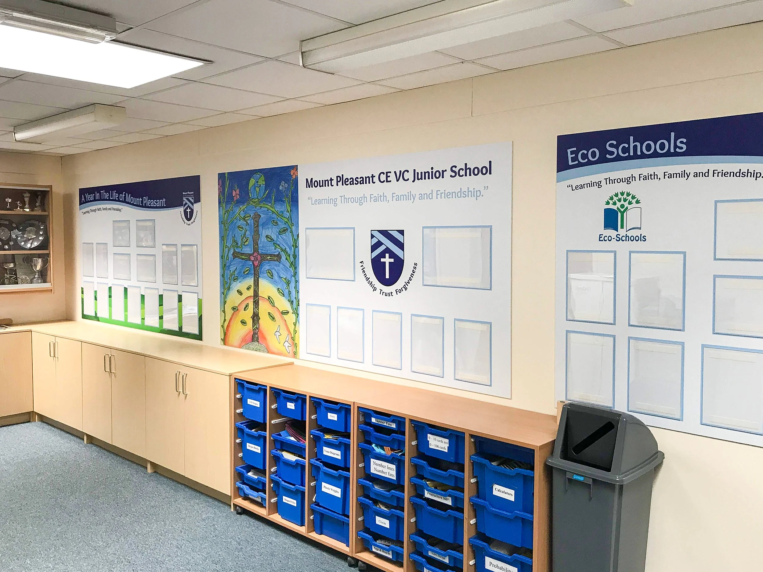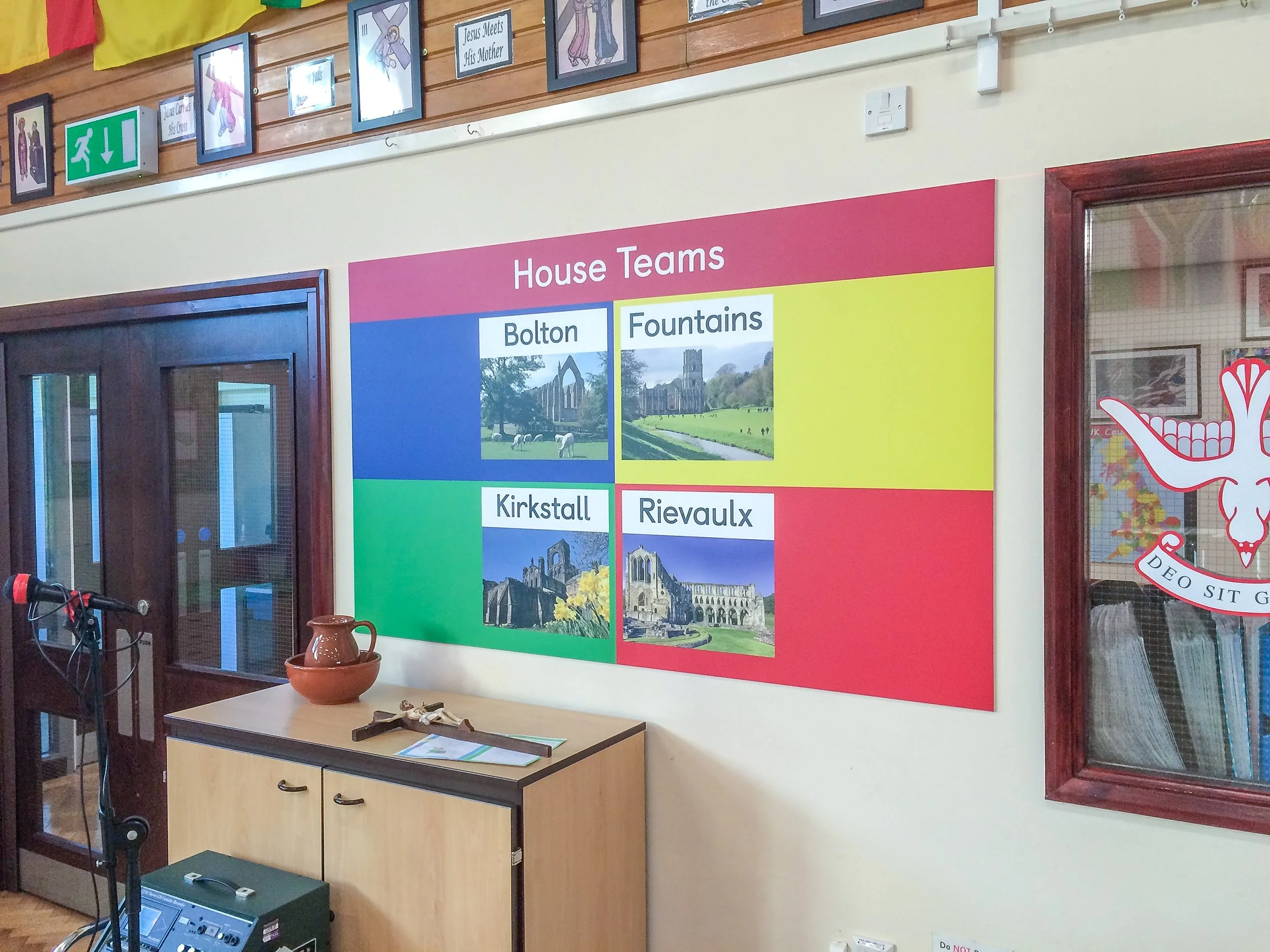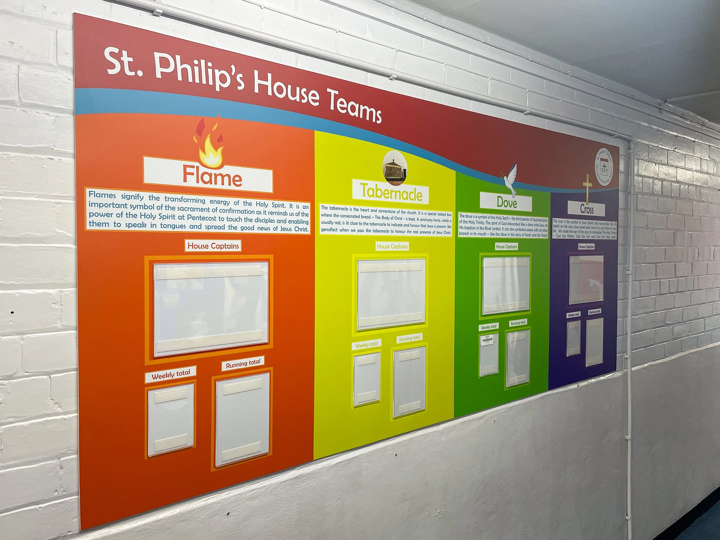 Acrylic panel with acrylic document holders fitted flush to wall with mirror fixings used in school entrance area
