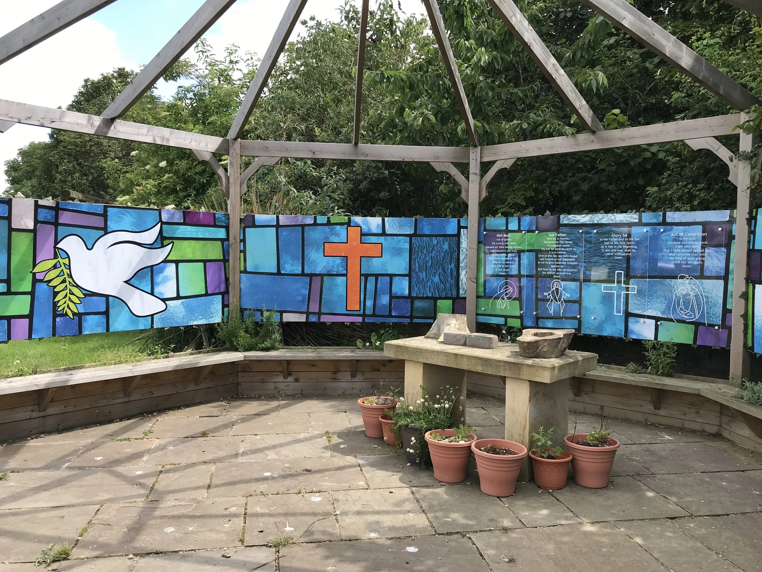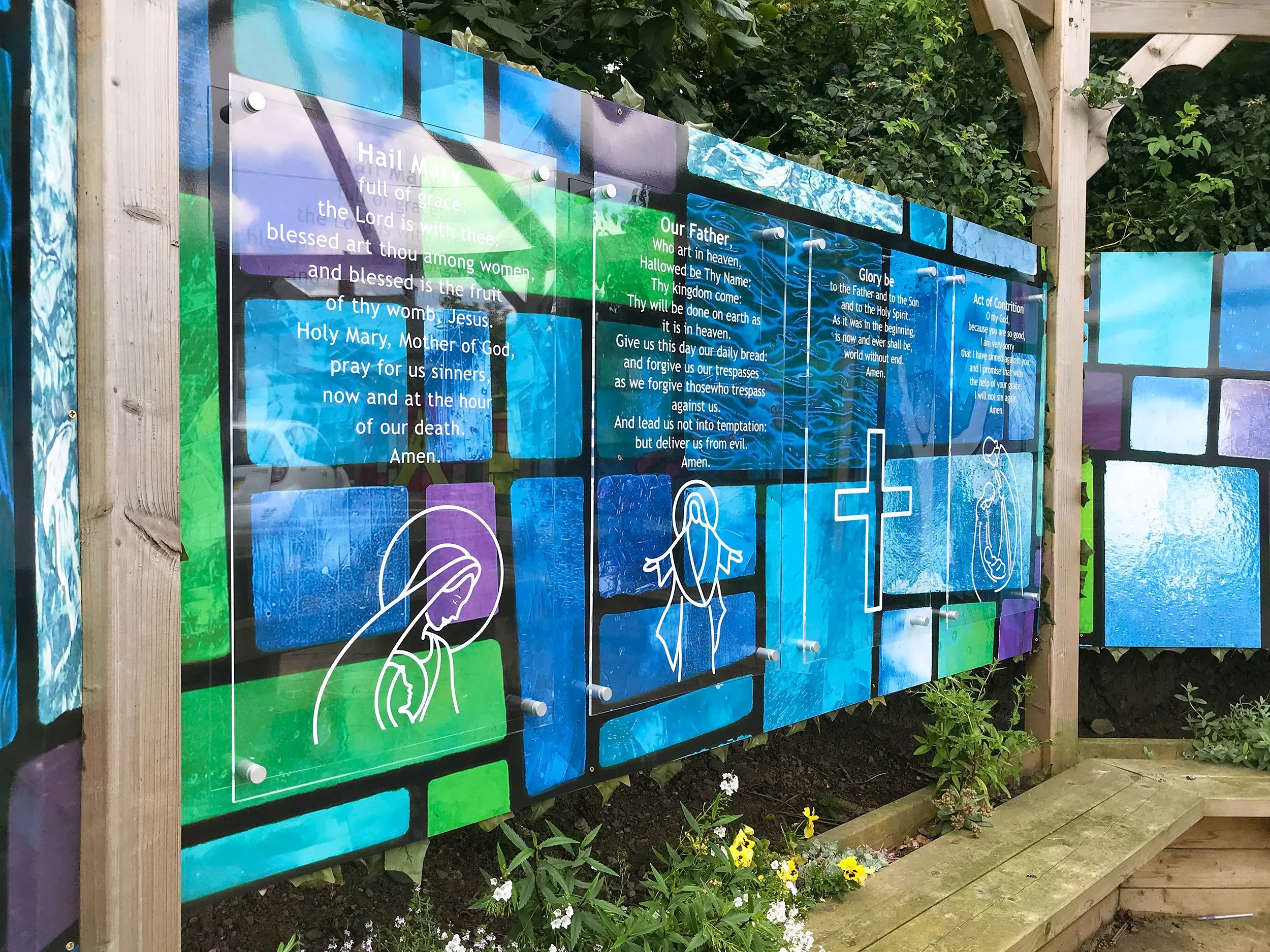 Outdoor prayer space with standoff acrylic panels on dibond panels