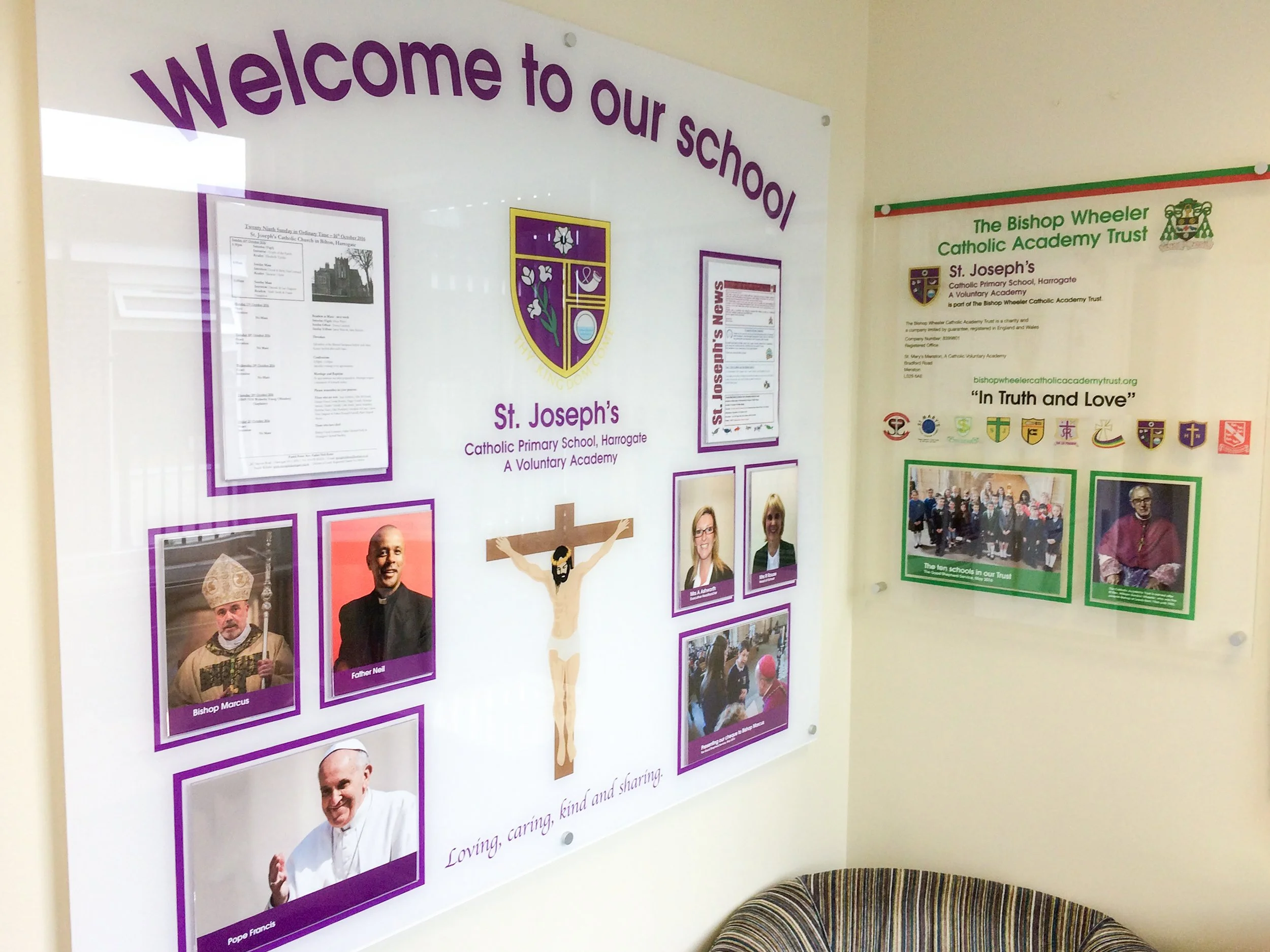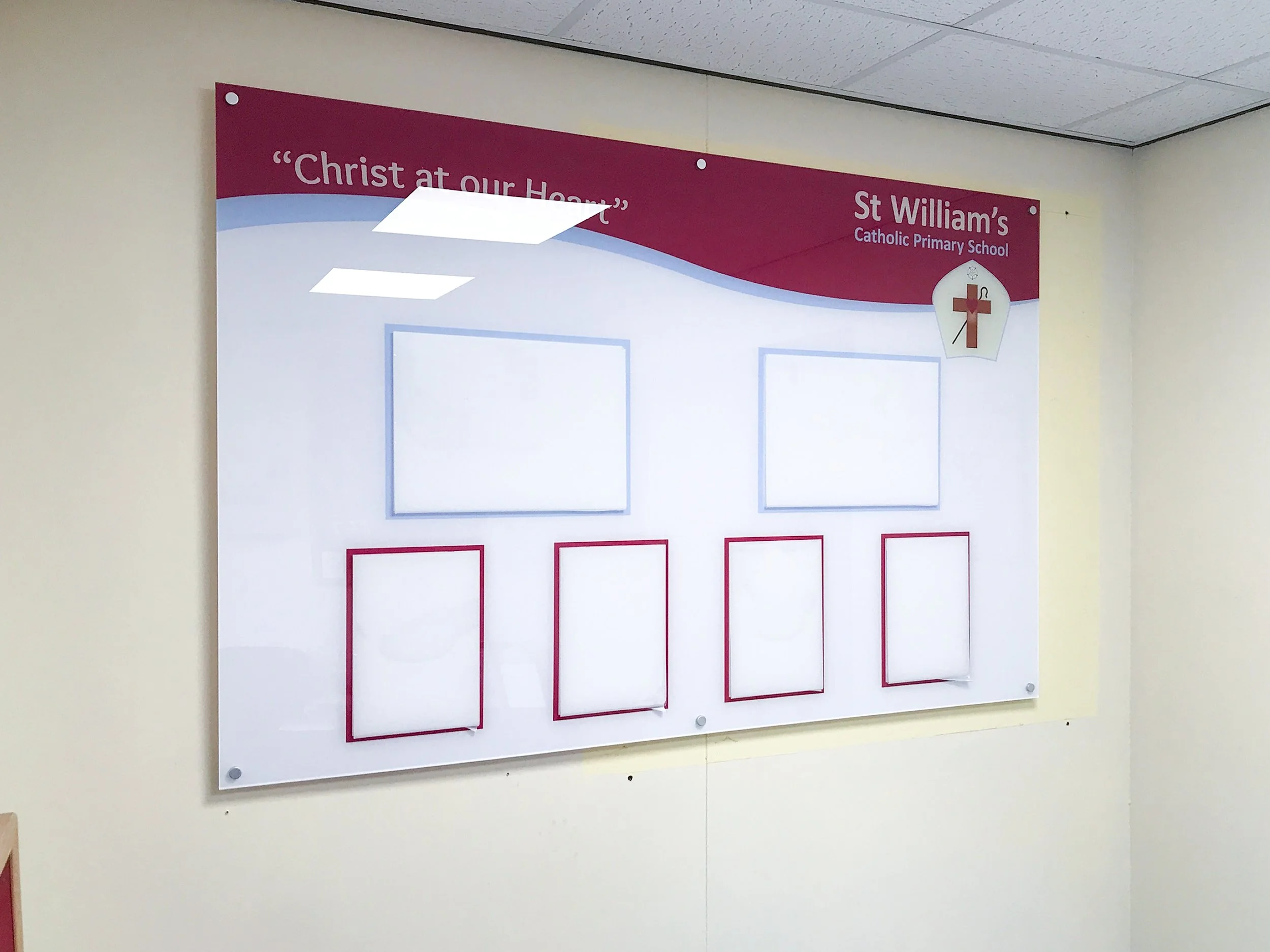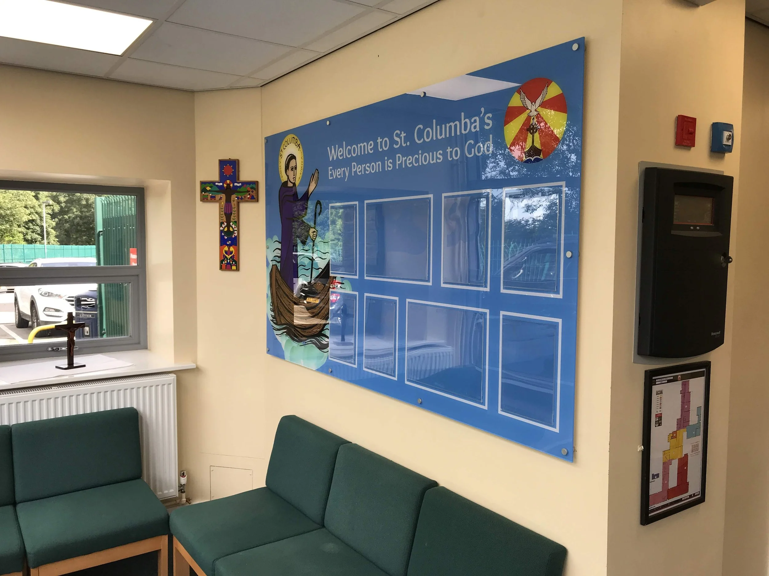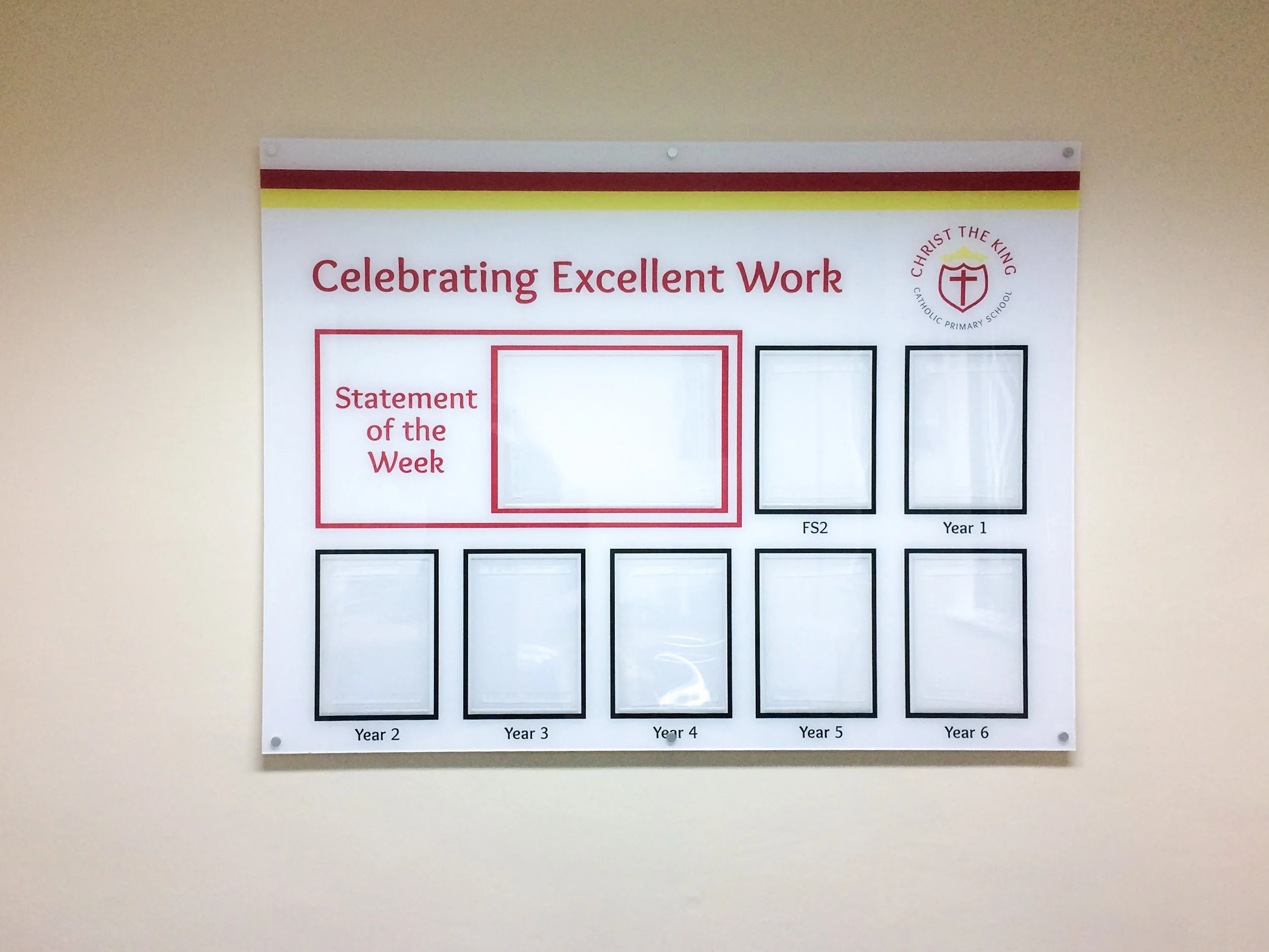 Acrylic panel with acrylic document holders and standoff fixings used in school entrance area