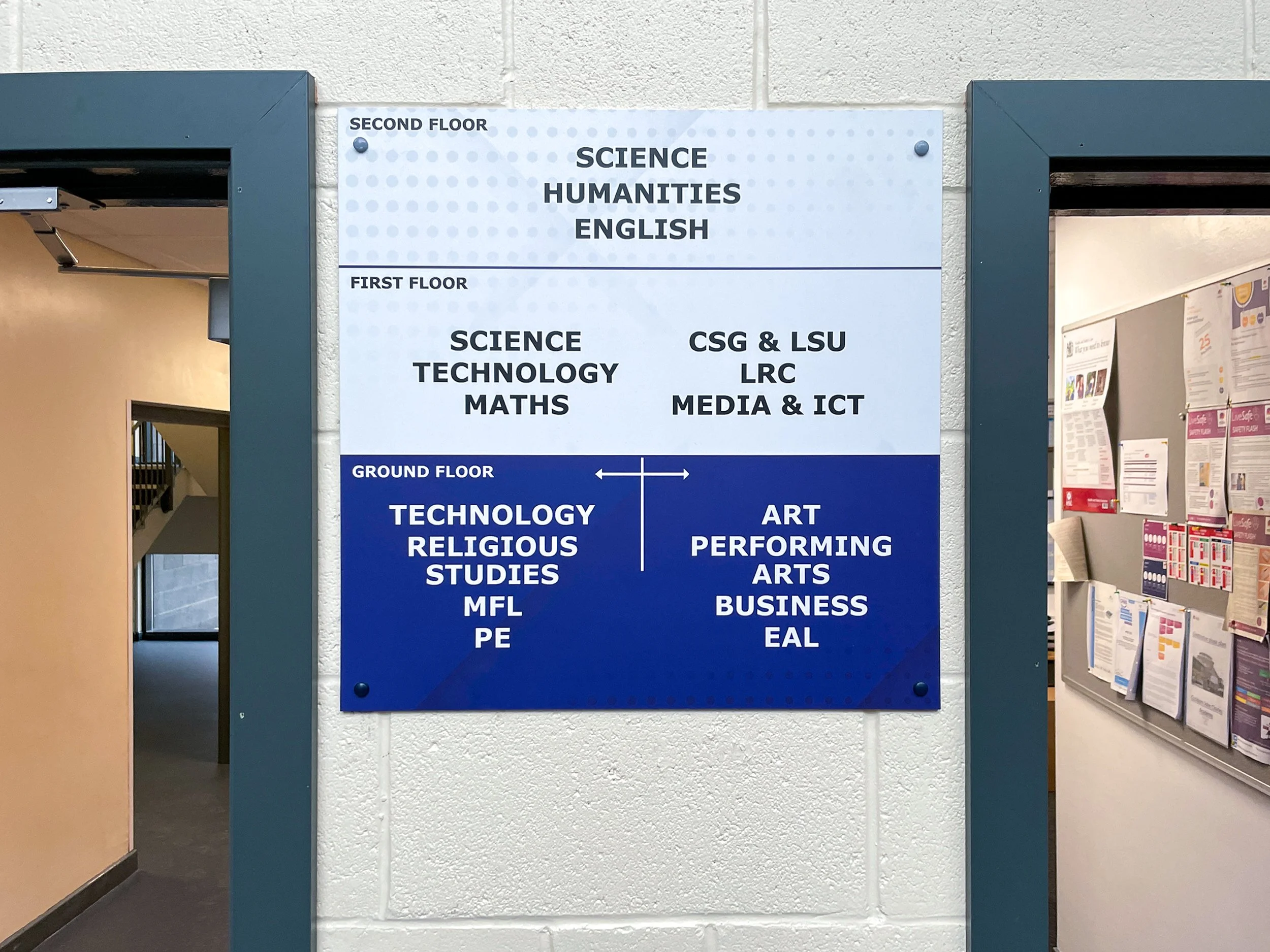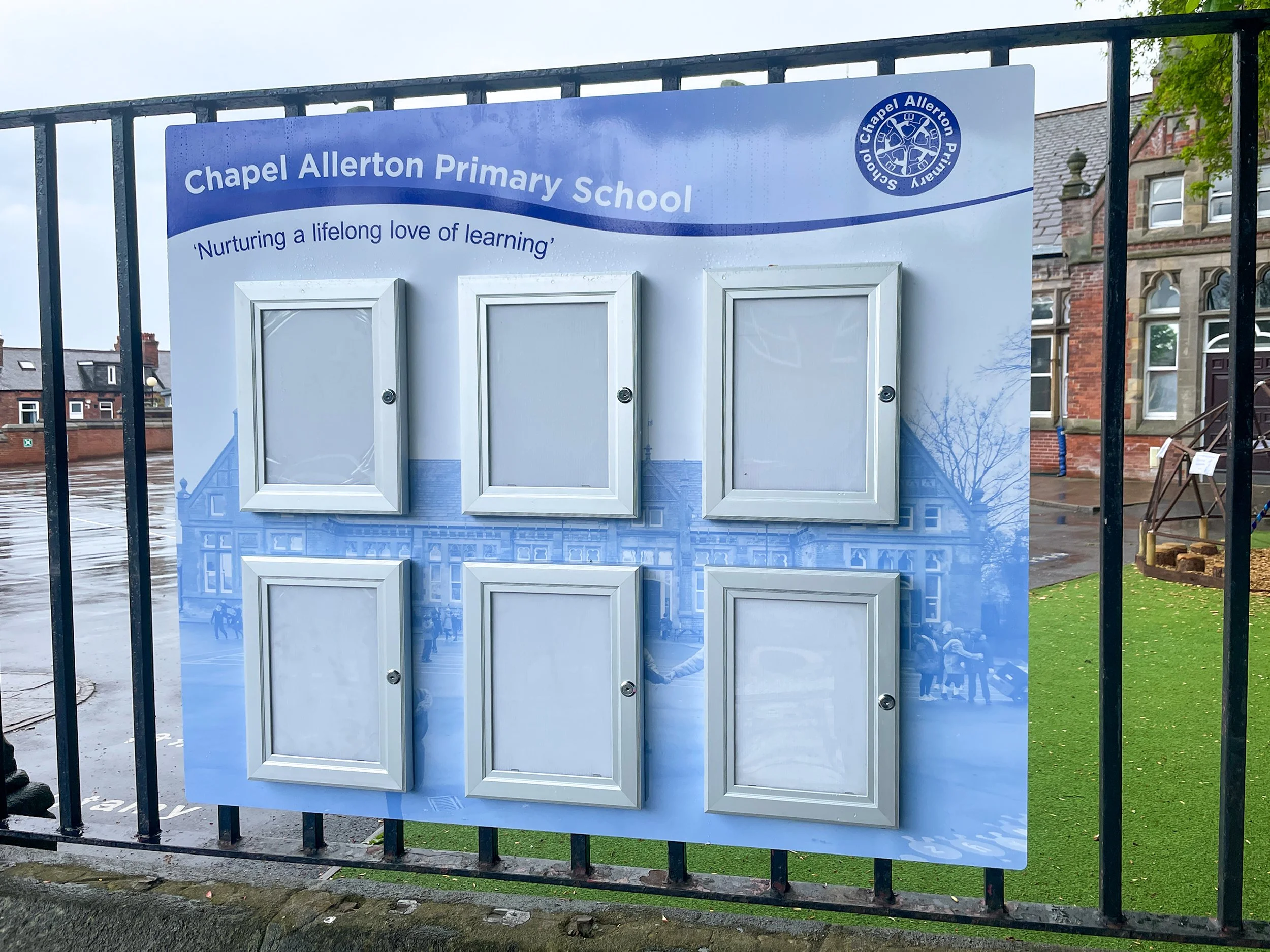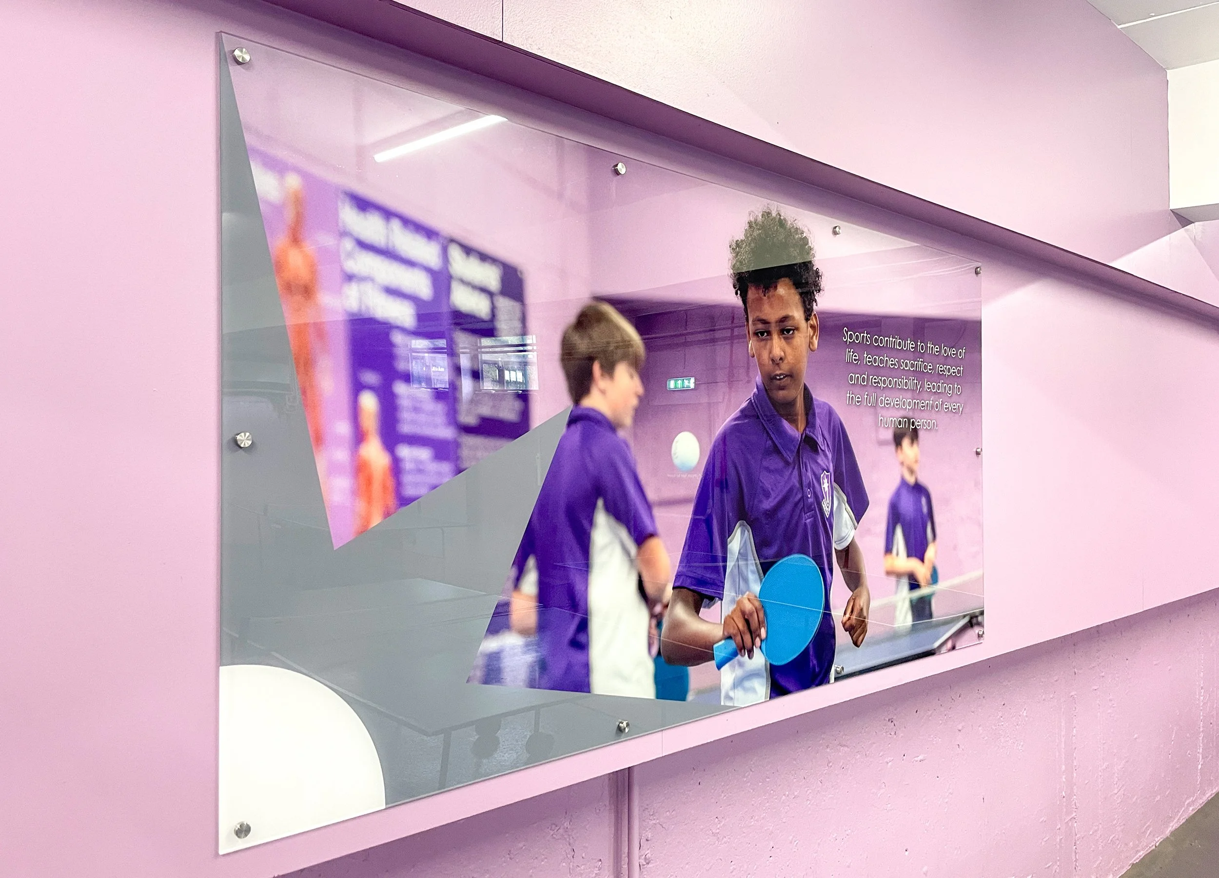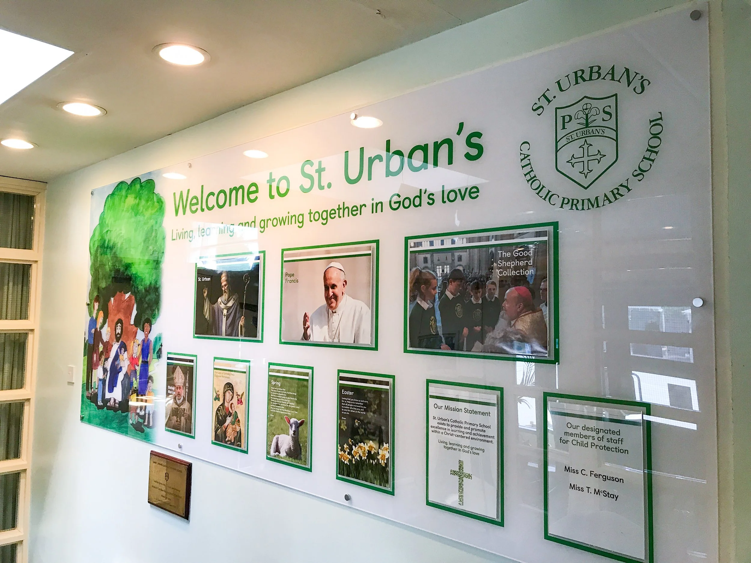Acrylic panel with acrylic document holders and standoff fixings used in school entrance area