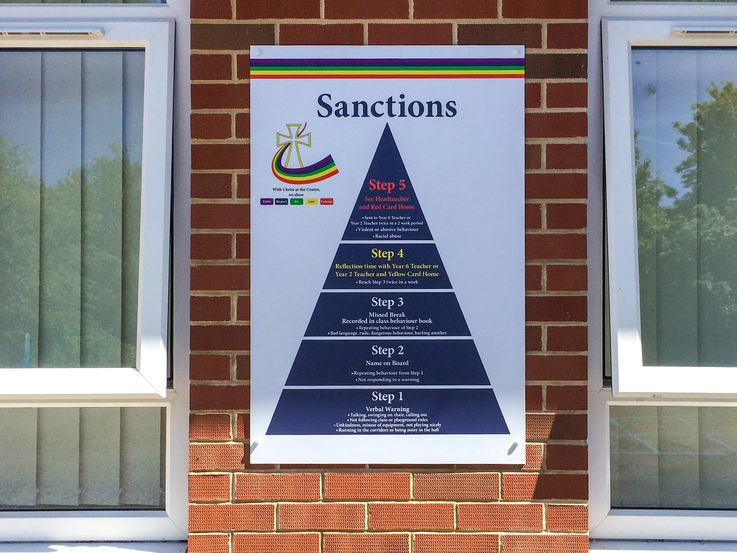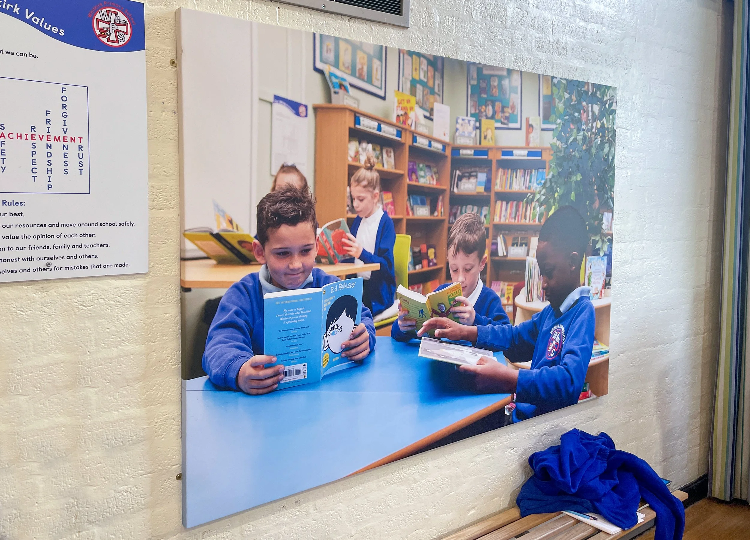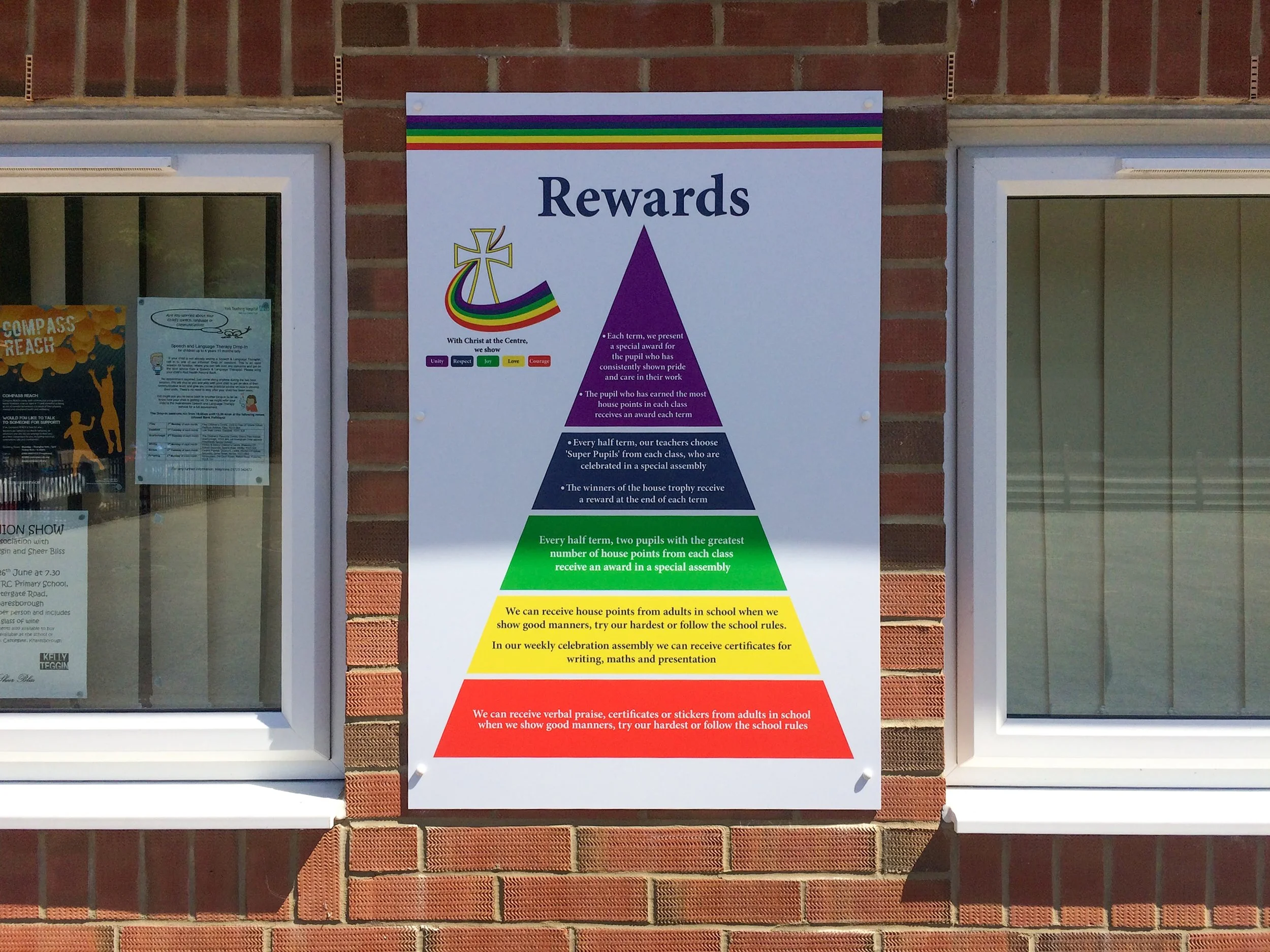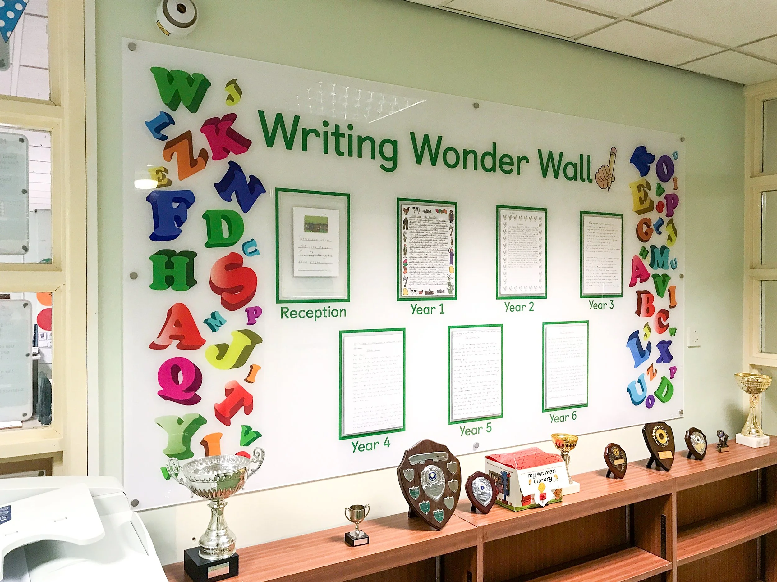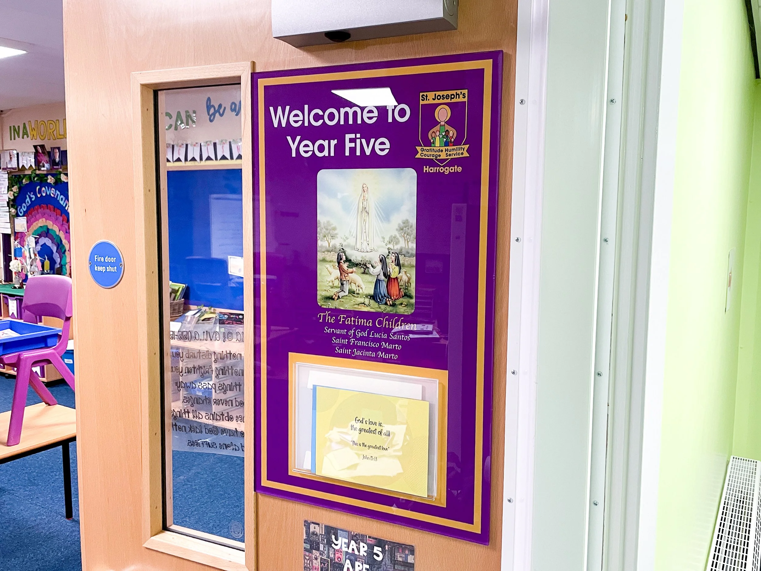 Acrylic panel with acrylic document holders and standoff fixings used in school entrance area